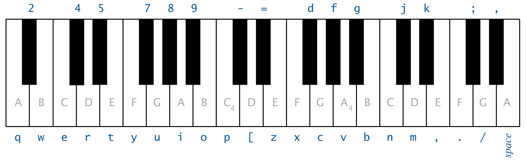 This keyboard arrangement imitates a piano keyboard: The "white keys" are on the qwerty and zxcv rows and the "black keys" on the 12345 and asdf rows of the keyboard.